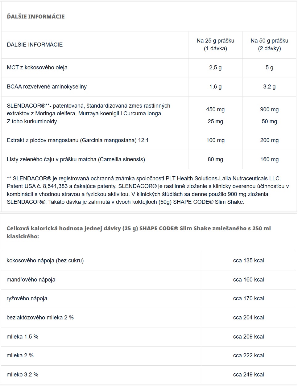 • patentovaná směs SLENDACOR® – synergické složení podporující hubnutí, je založené na třech rostlinných extraktech: z oddenku kurkumy, z listů kari a z listů moringy olejné
