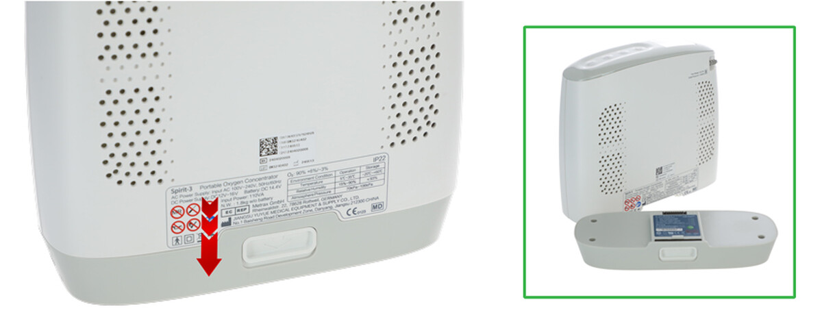 Přenosný kyslíkový koncentrátor je vybavený modulární litiovou baterií, kterou je možné dobíjet ze standardní elektrické zásuvky. Součástí balení je taktéž adaptér na napájení přes 12 V autozapalování. Maximální doba nabíjení baterie je přibližně 3 hodiny a 40 minut (od úplného vybití po úplné nabití, v závislosti od zdroje energie a použitíí).
