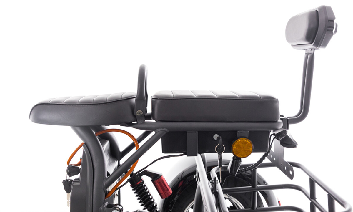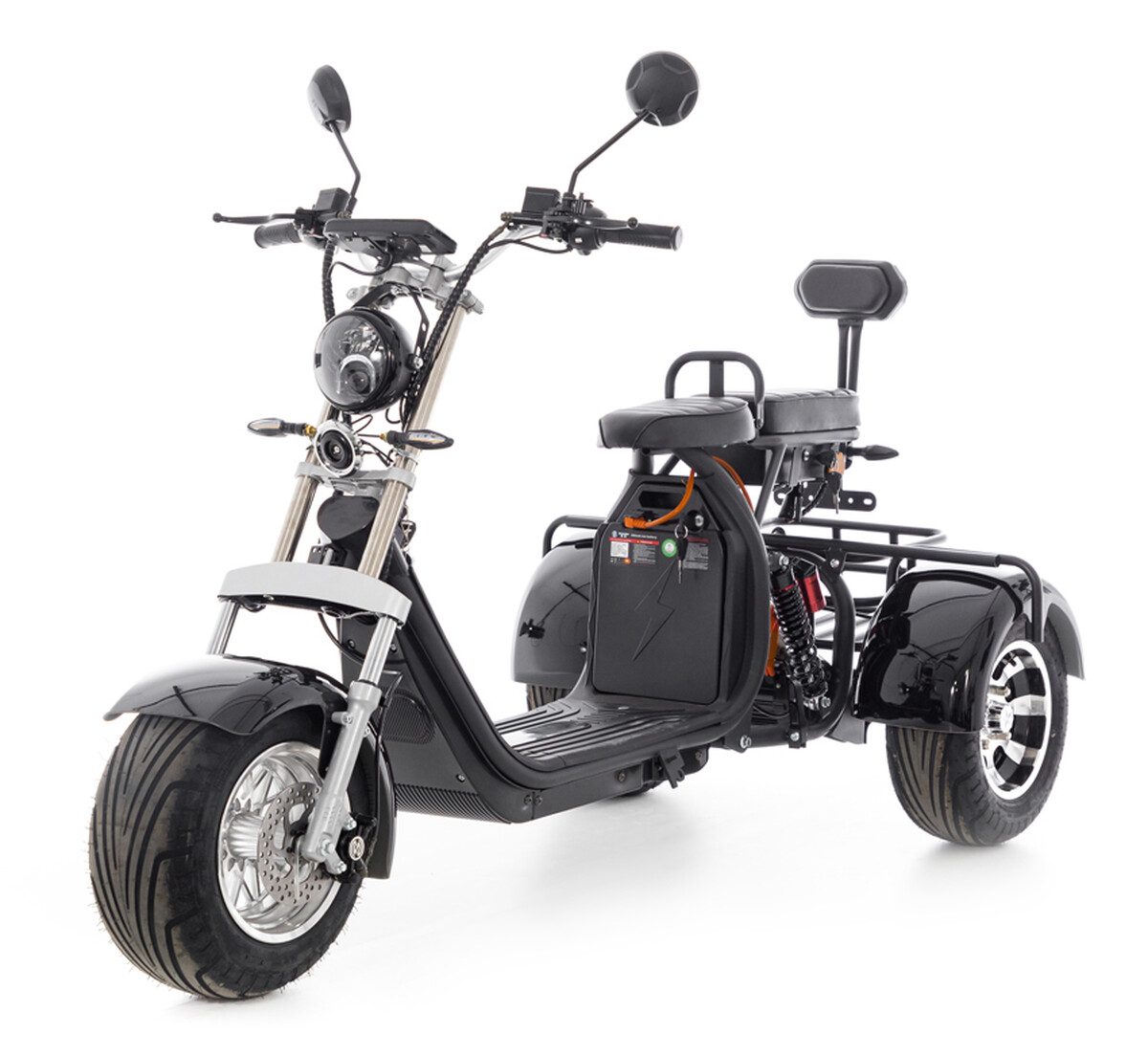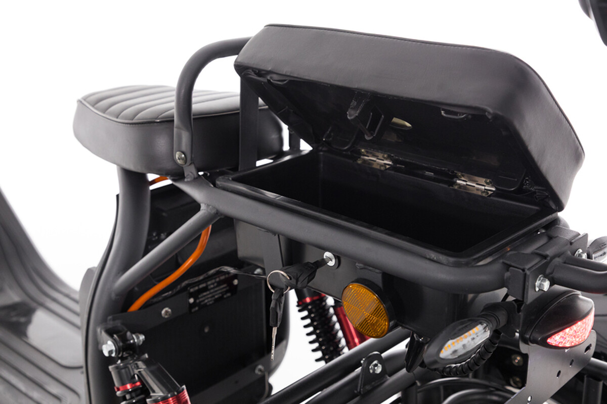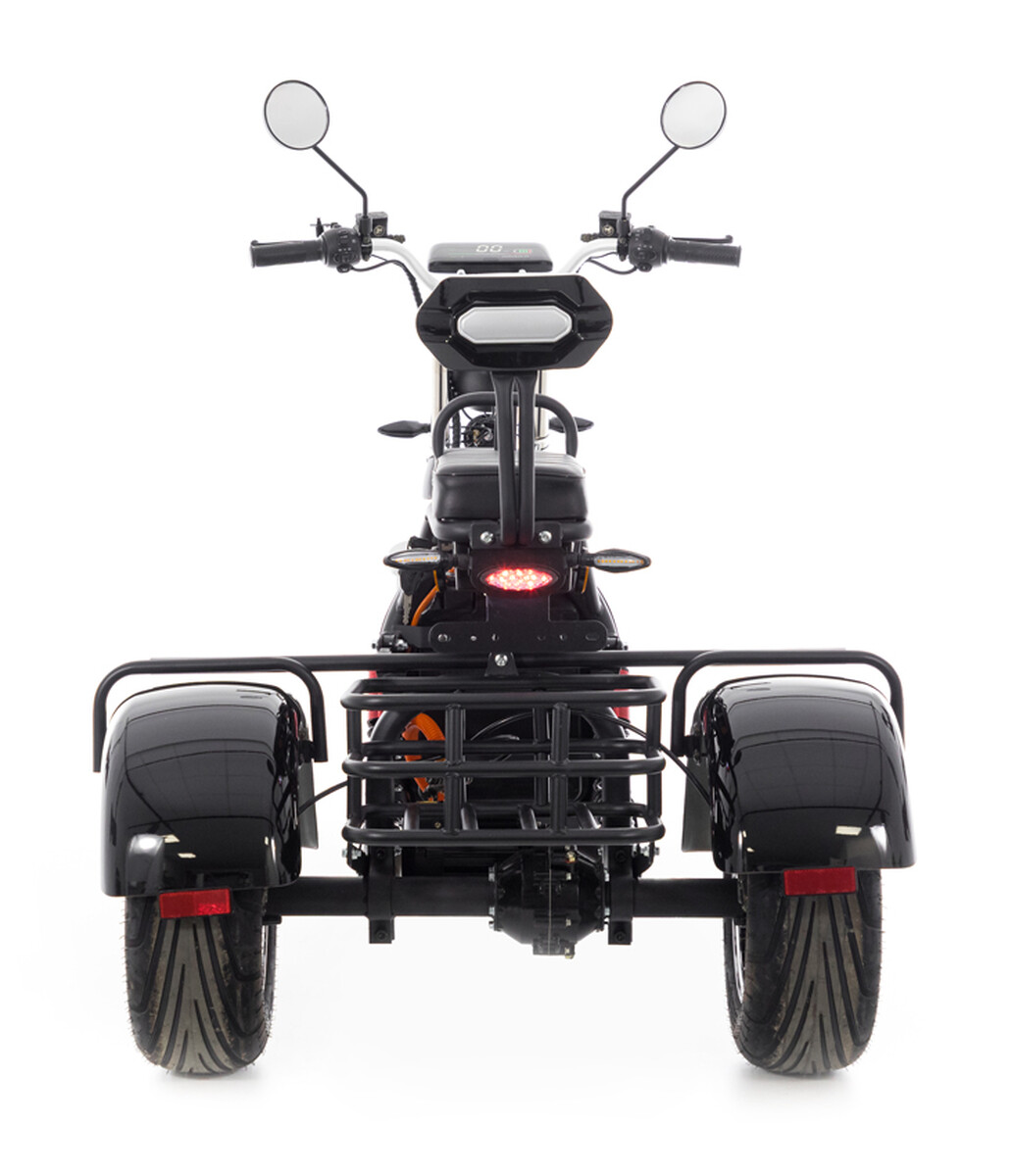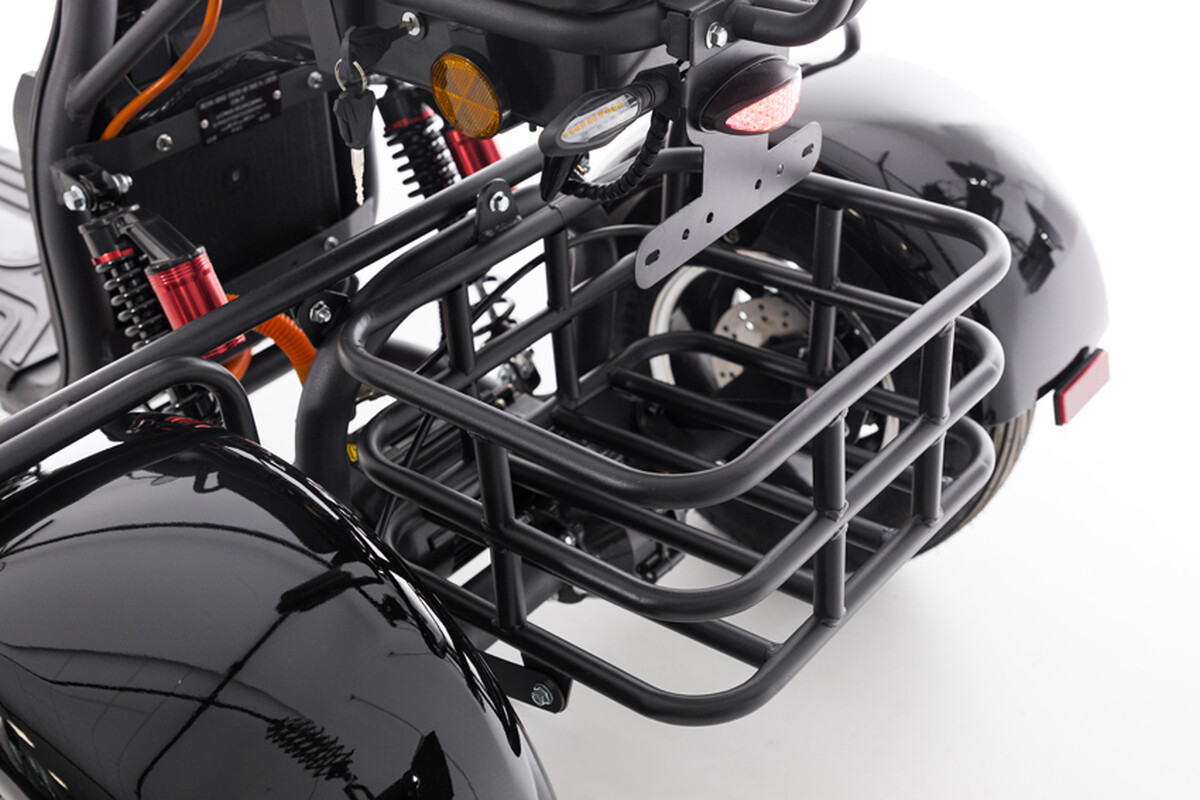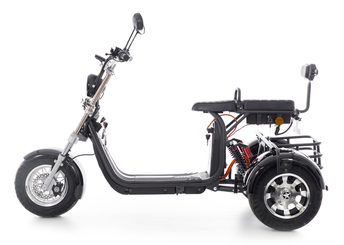 Elektrický tříkolový skútr chopper s výkonným 2000 W motorem a dojezdem až do 60 km. Pohodlná jízda i pro dvě osoby.