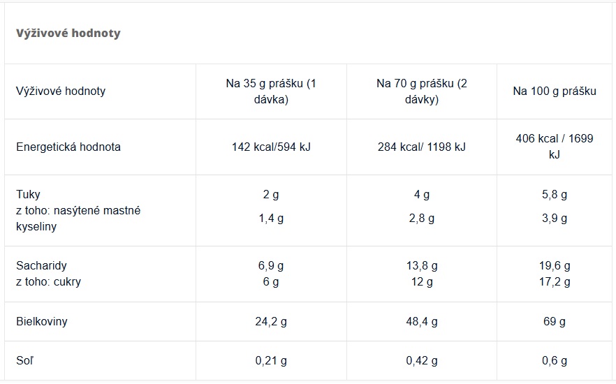 - dvě plné odměrky prášku (spolu 35 g) do 200 ml studené vody nebo do oblíbeného rostlinného nápoje a dobře protřepte
