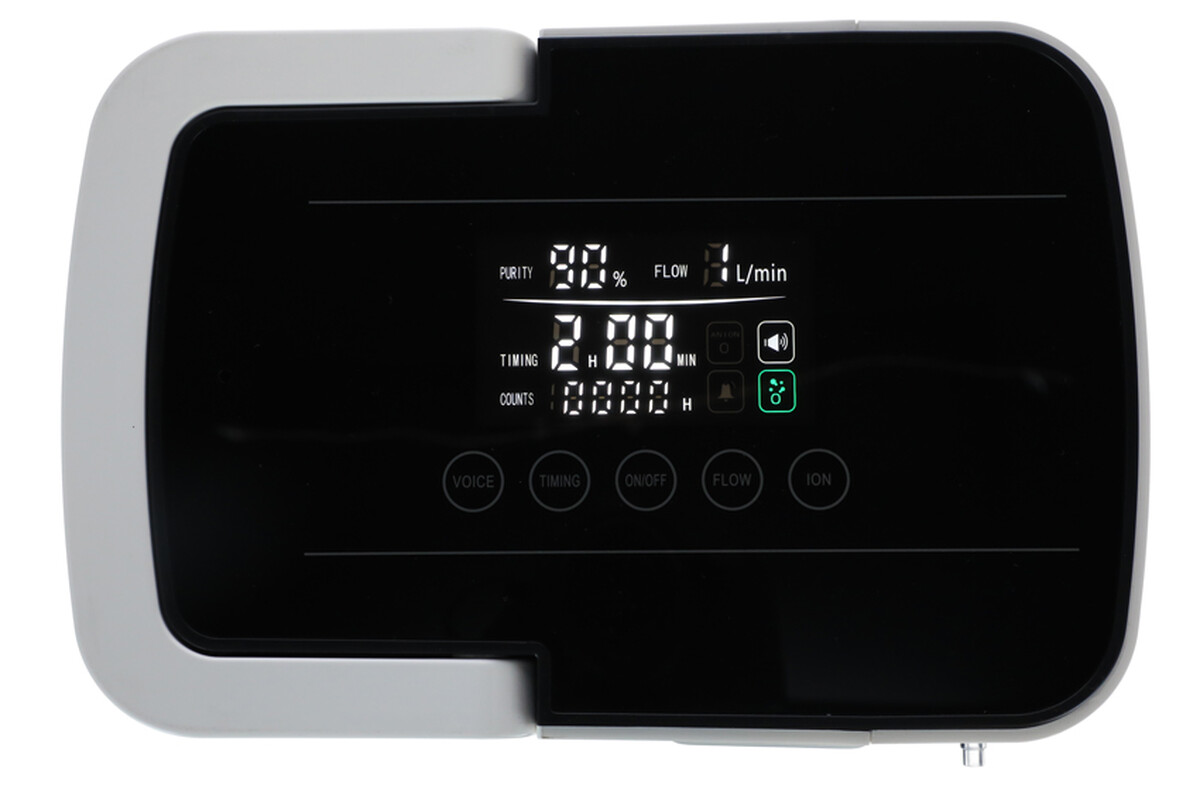 K ovládání kyslíkového koncentrátoru je k dispozici přehledný panel s podsvíceným displejem, kde je zobrazovaný aktuální průtok, koncentrace, uplynulý čas a odpočet provozních hodin. K ještě pohodlnější obsluze poslouži přibalený dálkový ovladač.