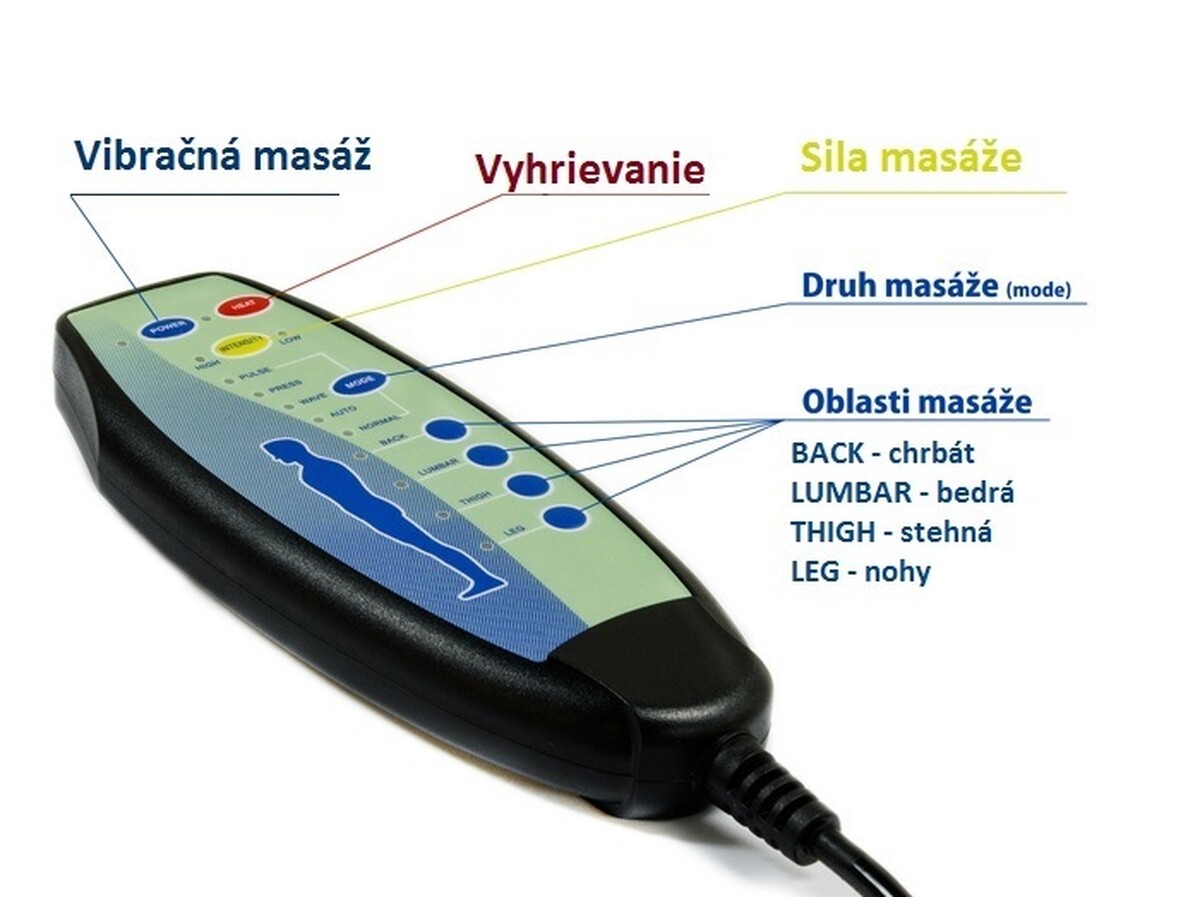 Křeslo disponuje elektricky polohovatelnou opěrkou zad a nohou ovládanou pomocí připojeného ovladače. Na dálkovém ovládání je též možné spustit 8-bodovou masáž a vyhřívání zádové, křížové, sedací a lýtkové oblasti, které poskytnou tělu příjemné uvolnění.