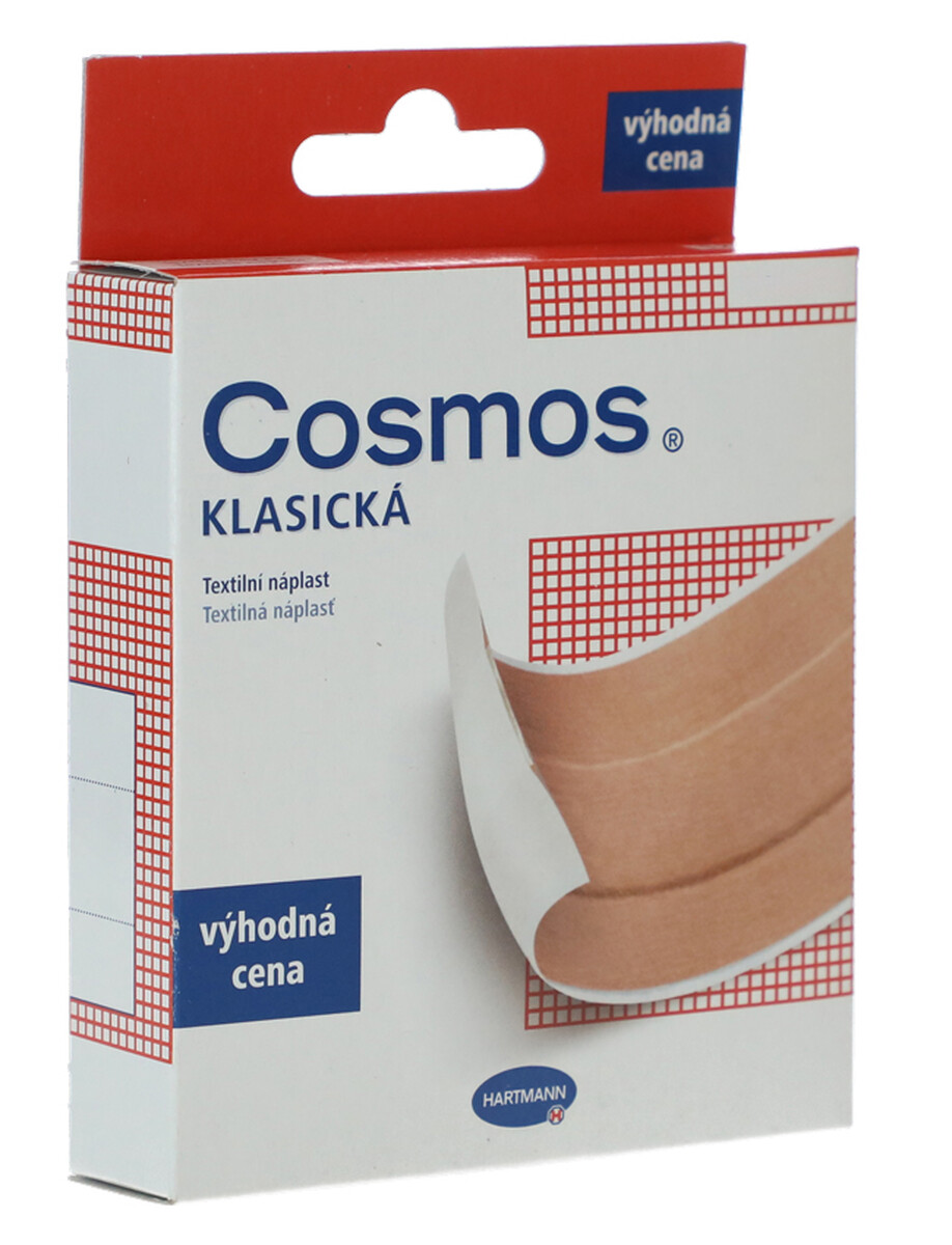 Klasická textilní náplast Cosmos díky níž si rychle a jednoduše přelepíte drobné poranění na pokožce. Vyrobena z odolného materiálu.